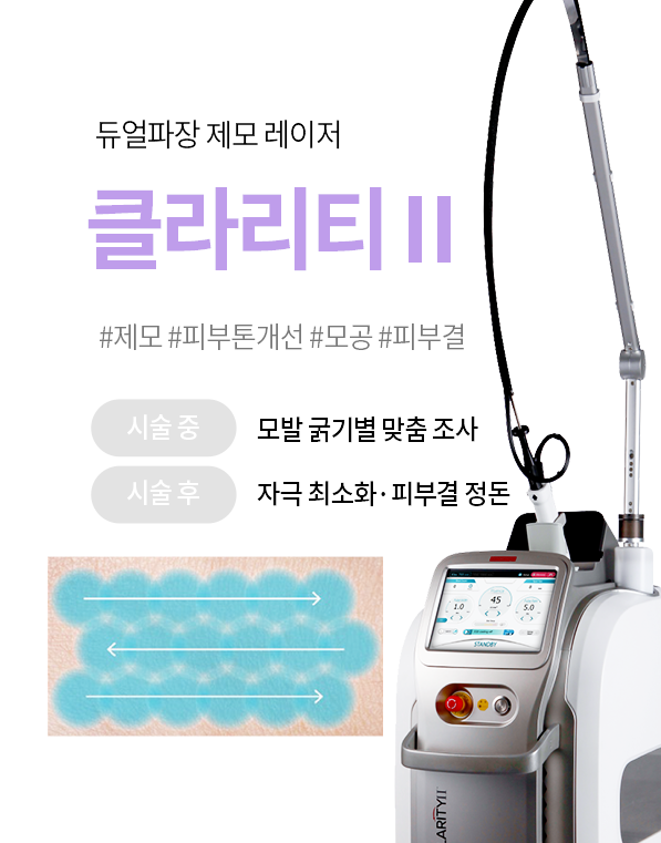 두 가지 파장(755nm, 1064nm)을 이용해 모발 굵기와 피부 타입에 맞춘 복합 시술이 가능한 클라리티2 레이저를 사용합니다.