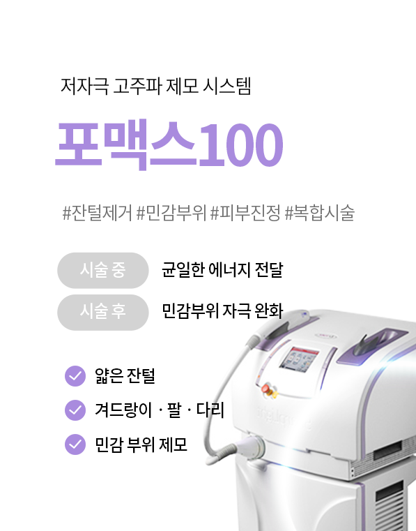 클라리티Ⅱ, 포맥스100, 원코스젯SR을 이용한 복합 레이저 제모로 부위별 모발 굵기와 피부 상태에 맞춘 시술을 진행합니다. 보다 균일한 조사로 자극을 최소화하며 위생적인 환경에서 시술이 이뤄집니다.